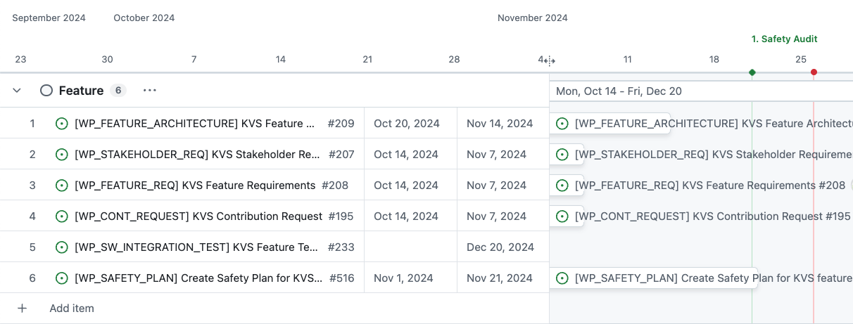 As GitHub Projects are not restricted to one repository but can include information from multiple repositories of the same organization, roadmap project gives an overview of all Sagas, that are relevant for the roadmap, including those ones in the software modules. Prerequisite for this is that project leads of all software modules always assign their sagas to the roadmap project. All sagas in the roadmap project are extended with additional information as e.g. start date and due date, to keep the status of the project always transparent. Additionally, the main S-CORE repository defines project wide milestones & releases, that are visible in the roadmap as well.