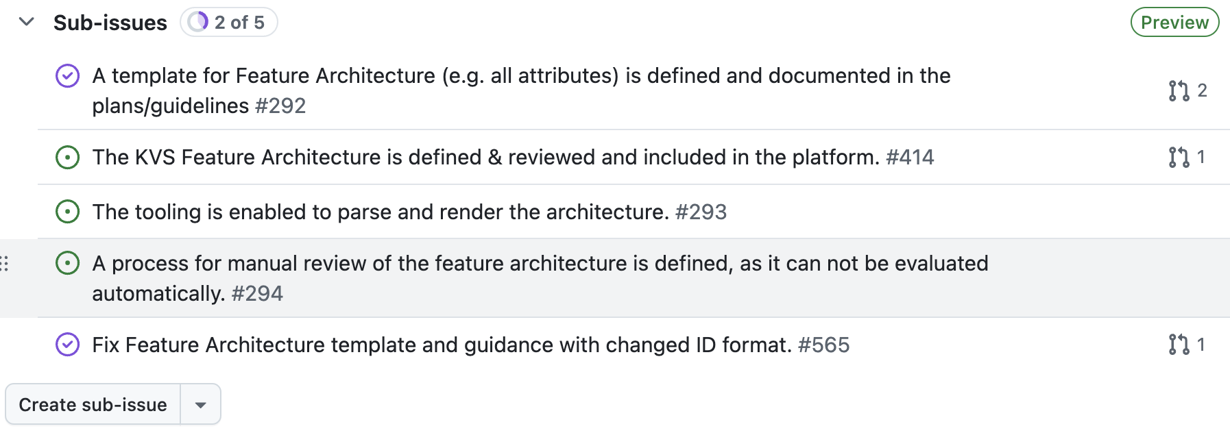 For a better structuring of the GitHub Issues, we use a beta sub-issue feature, that should be officially released in the beginning of 2025. Sub-issue feature allows to create a “parent-child” relationship between GitHub Issues. That allows better structuring of the project and helps to keep GitHub Issues, that are related to the same topic, together.